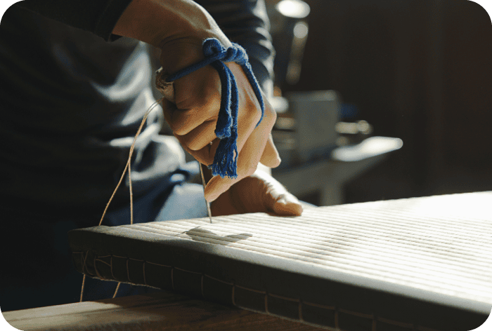 赤ちゃんに配慮し、金具を一切使用せず、畳職人が長年の経験で培った技術を使用して、一つ一つ手作業で丁寧に製作。手作業の温かみが感じられ、自然の素材とともに、使うたびにその魅力を実感できます。
