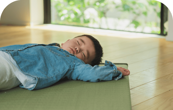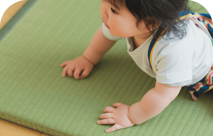 畳の原料となるい草は、調湿効果も抜群で汗をかきやすいお子様の寝具にも最適です。断熱効果も優れていることから、夏はさらりと快適に、冬はほのかに暖かく四季を通じて心地よい環境をつくることができます。